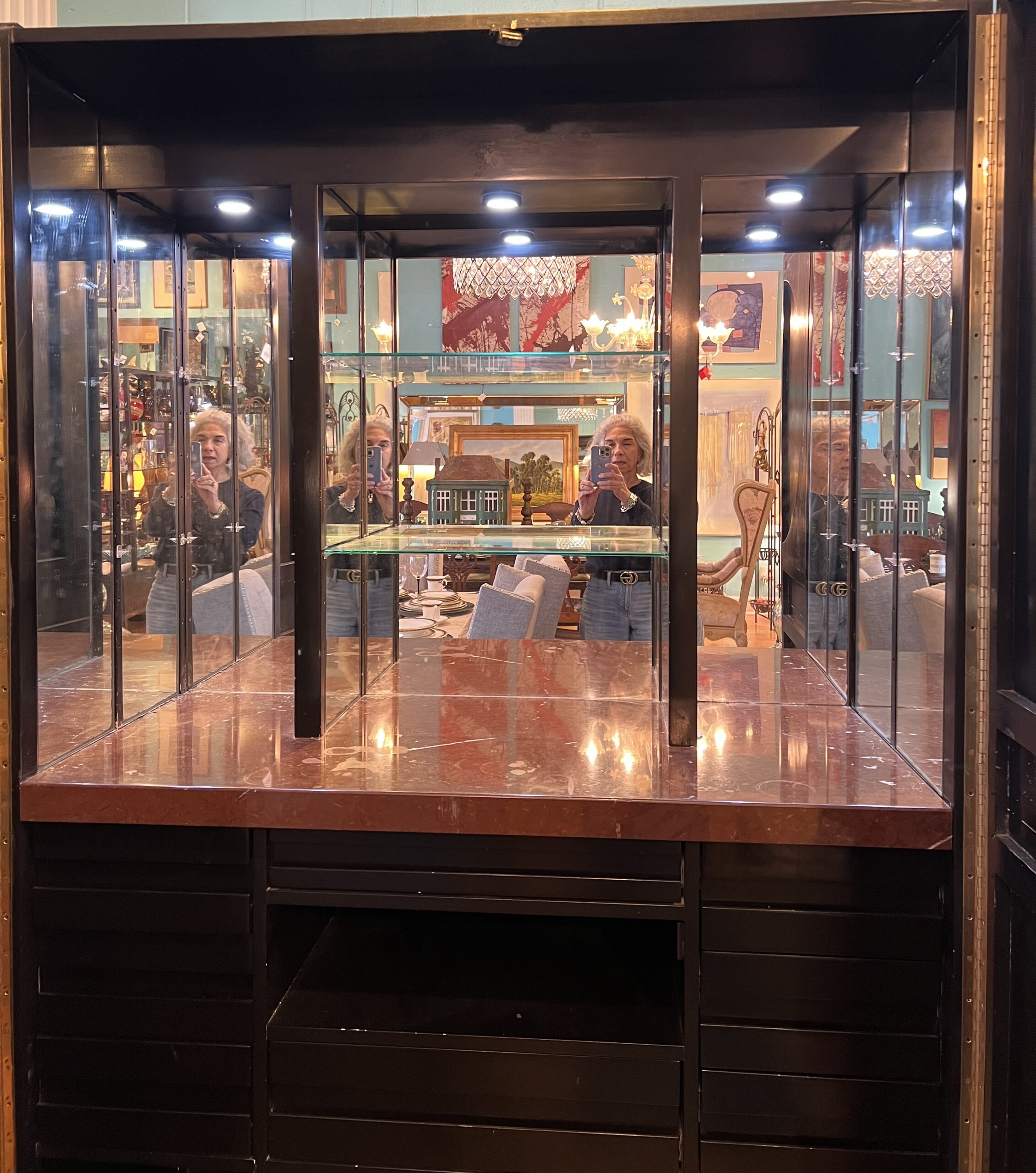 Antique Chinese Wedding Cabinet, carved and hand-lacquered in red and black with gold detail. The bar conversion includes lighting, a mirrored back and marble surface. Original cabinet, circa 1900, houses 8 drawers: 1 silverware drawer and space for bottle storage in bottom drawer.