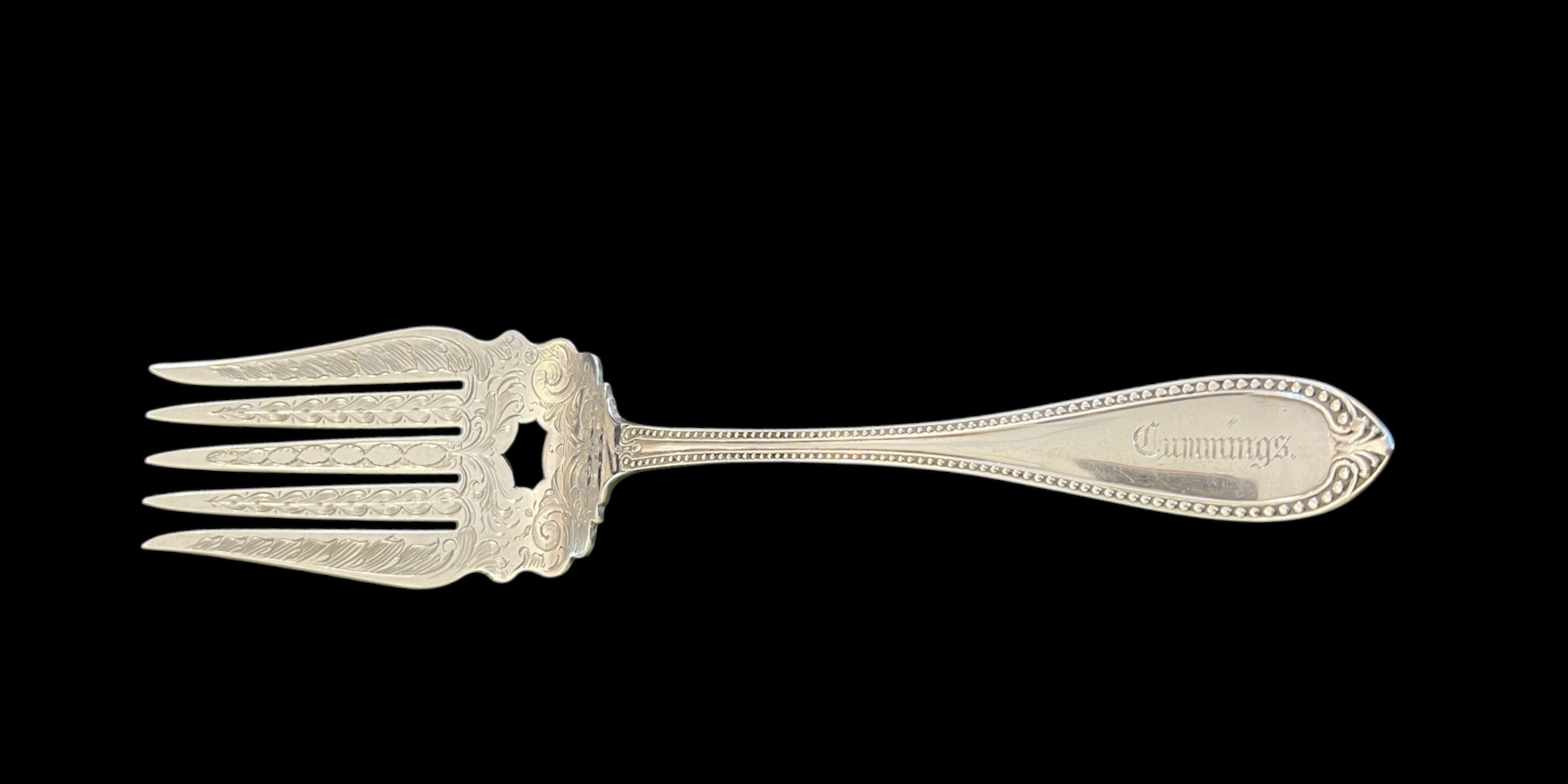 10″ Antique Tiffany Sterling Meat Fork, with chased tines, circa 1864. Family name ‘Cummings’ is hand inscribed on face of fork handle.