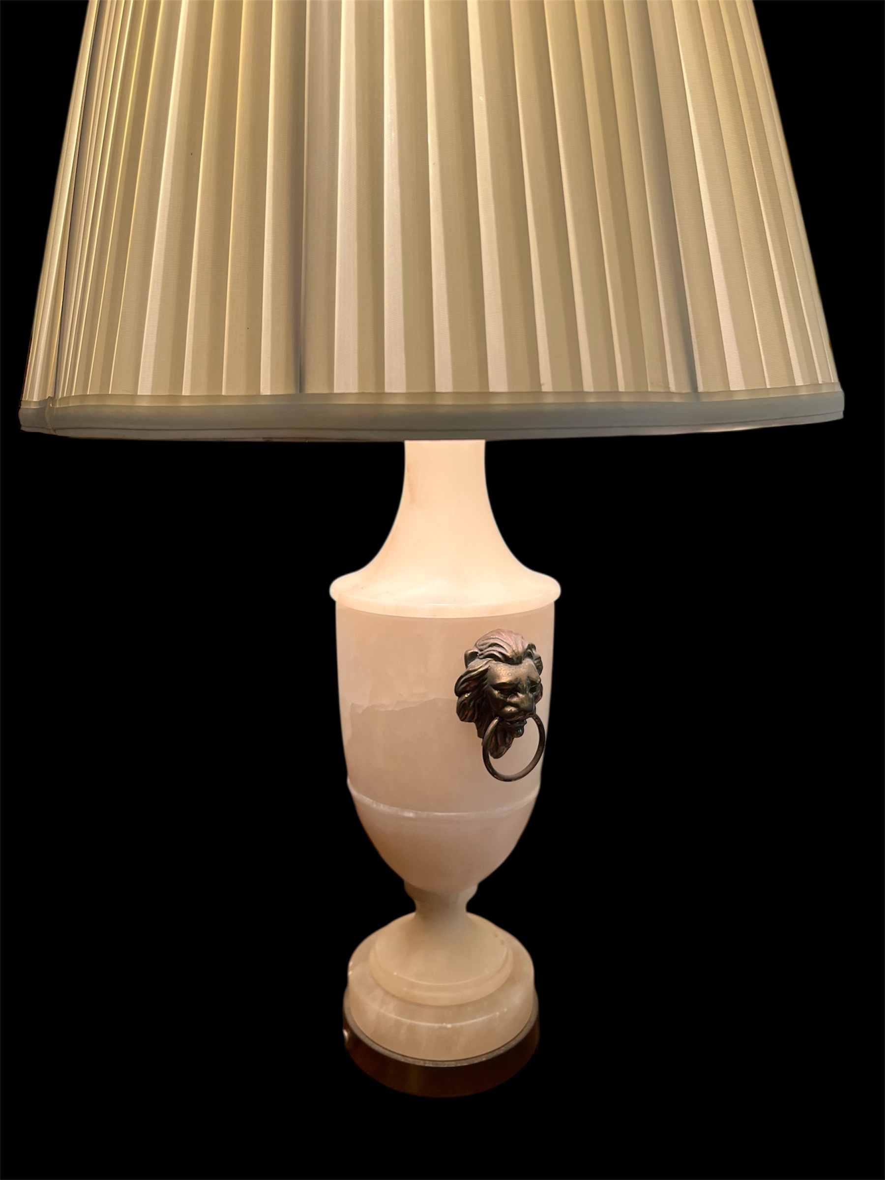 31″ Tall Brass Lion Alabaster Lamp, with knife-pleated shade. Solid brass lion ‘door-knocker’ , and base.