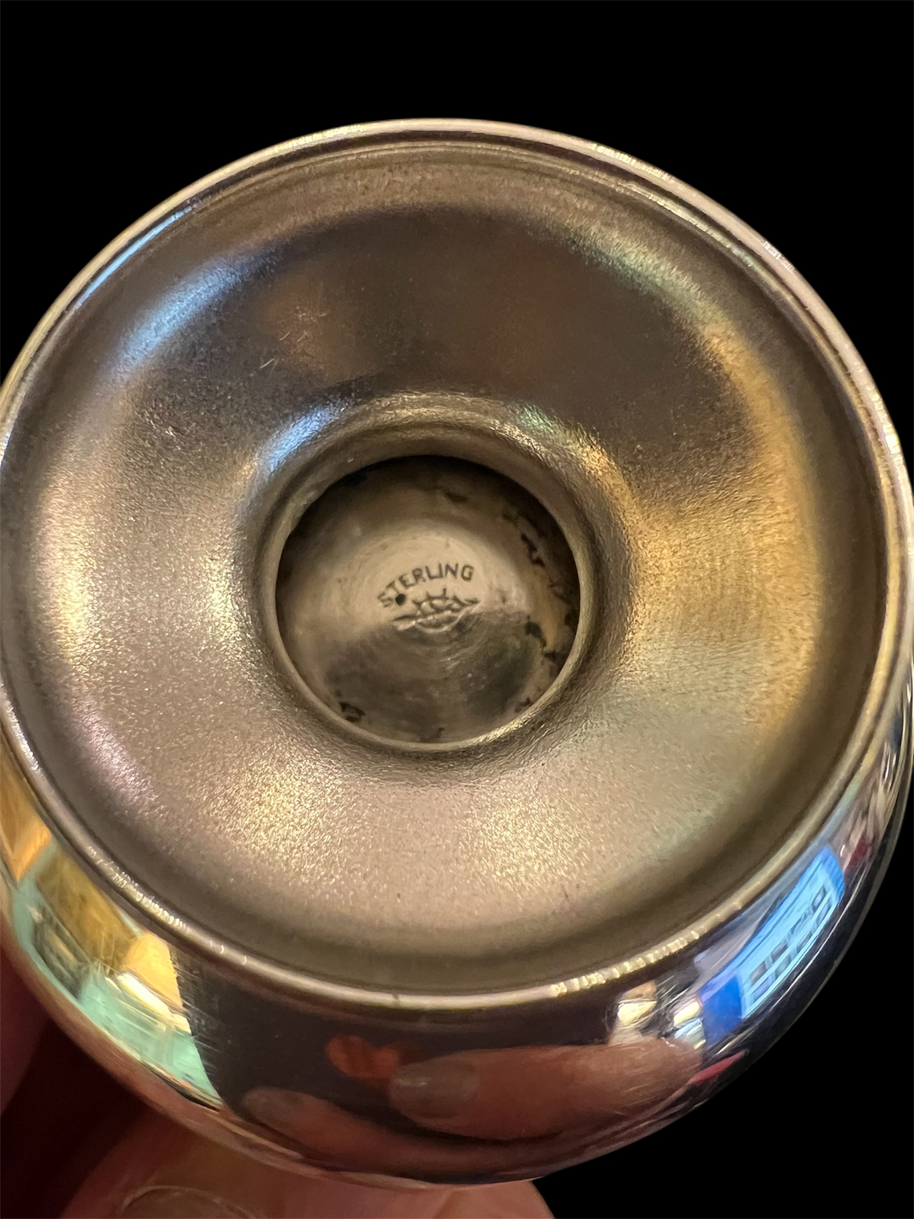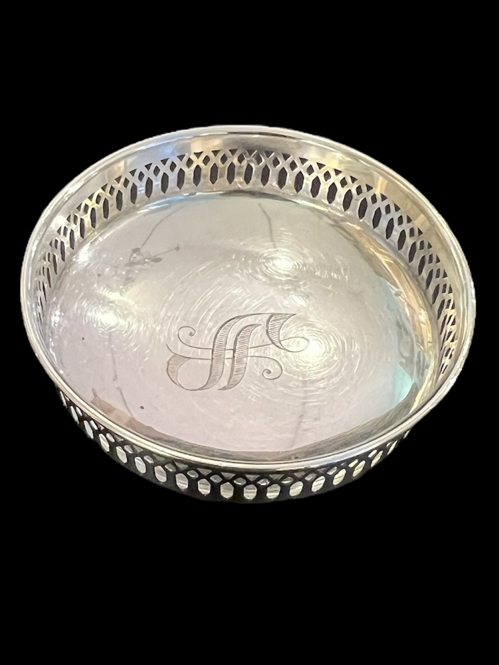 Footed Dozen Sterling Silver Nut Dishes. 12 individual pieces, hallmarked with gallery edge. Excellent Vintage-Antique condition, hand engraved monogram in center of bowl, 2 1/2″ diameter x 1 1/4″h.
