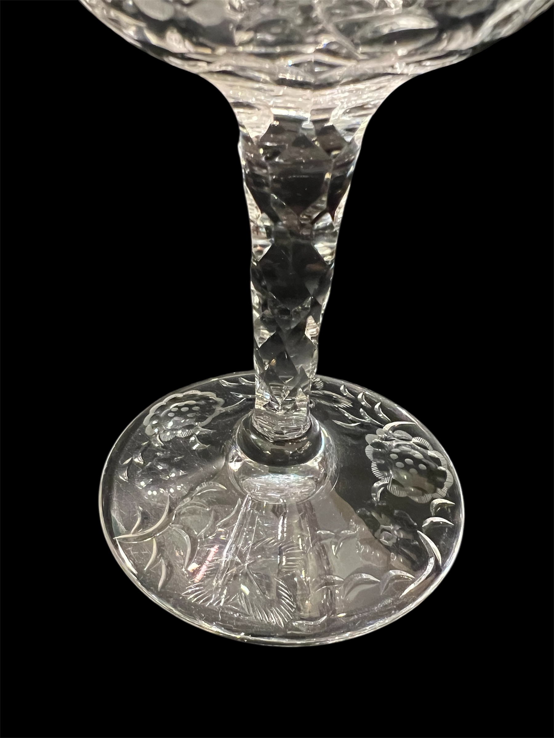 Set of 10 Floral Cut Crystal Wine Glasses, 6 1/4″h handcut flower, fruit and leaf design with faceted stems.