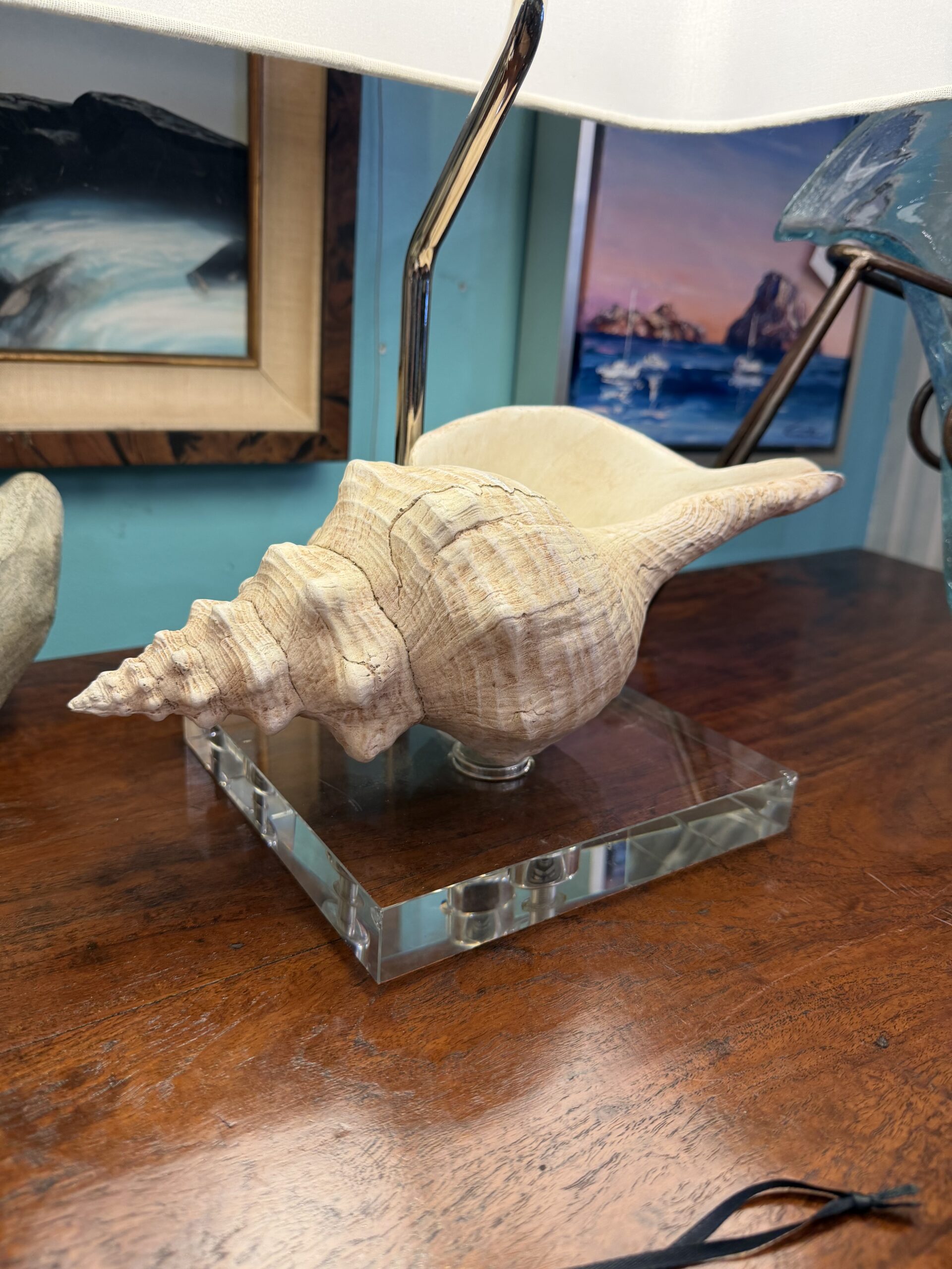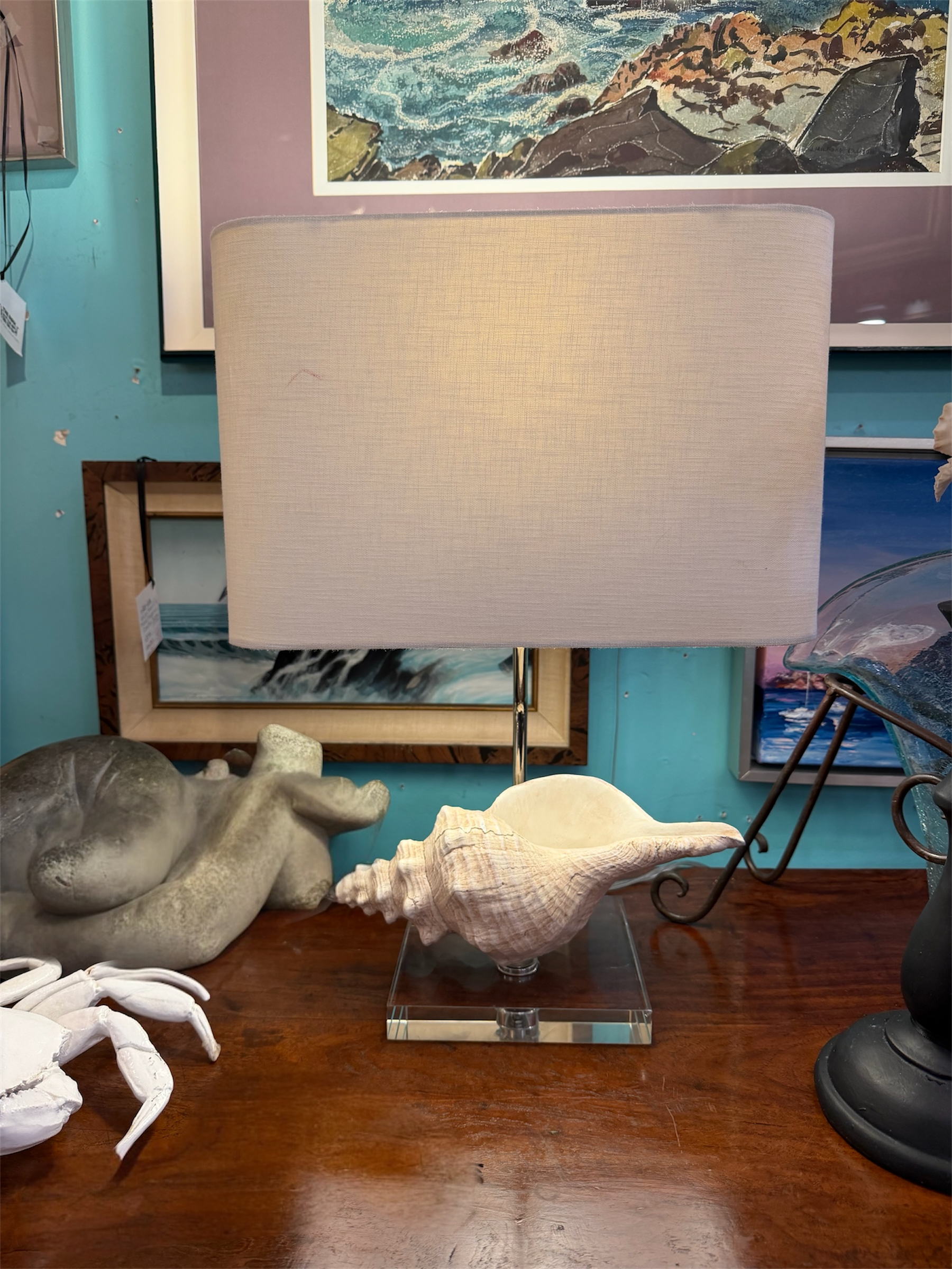 Horse Conch Shell Lamp Base, genuine shell mounted on a lucite base with oval linen shade. Lamp with shade measures 12″w x 21″h.