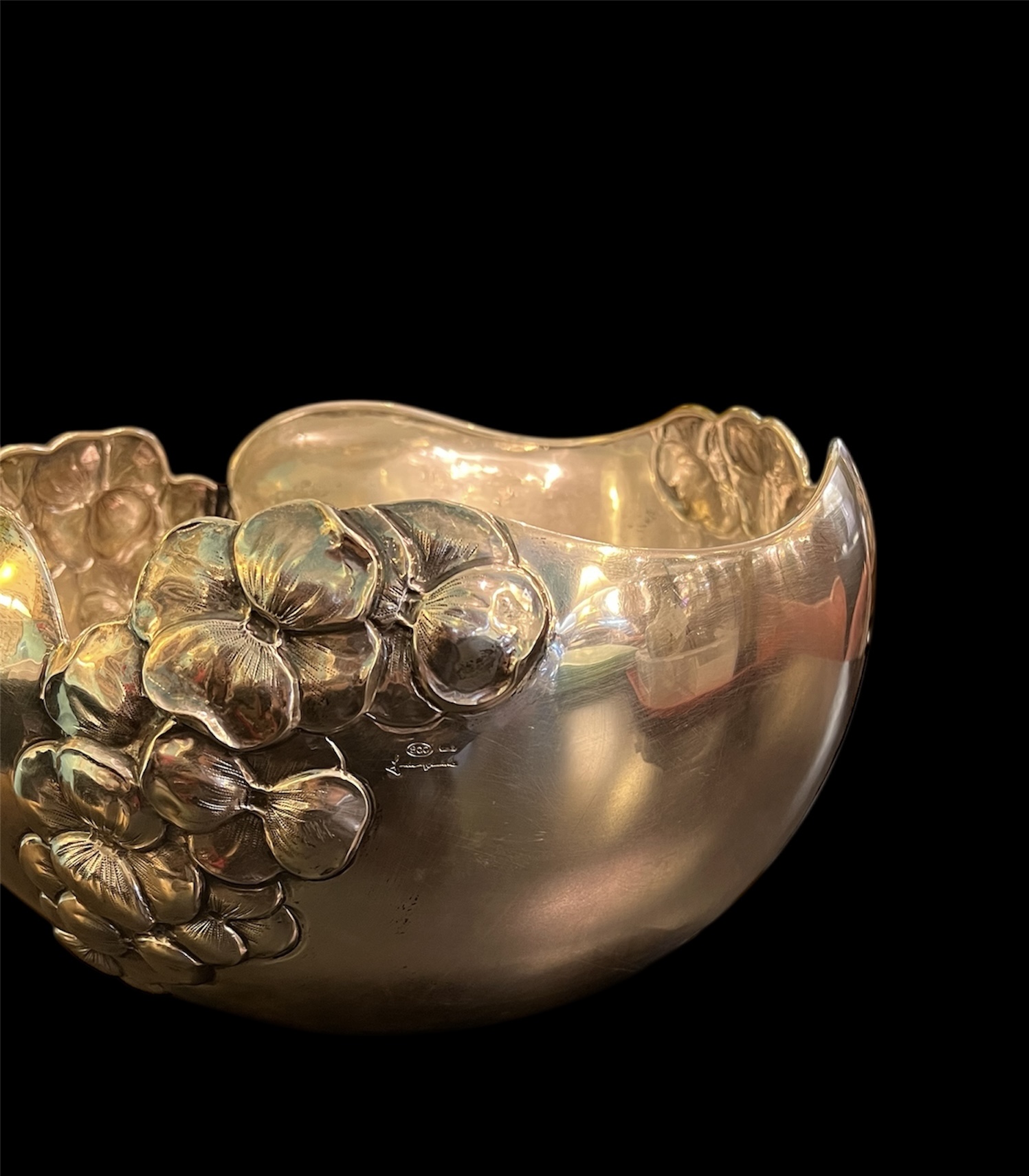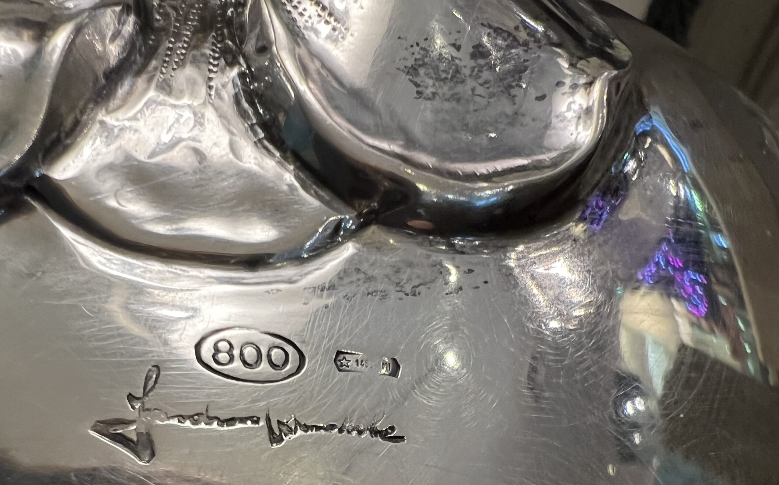 20th Century Italian Hallmarked 800 Silver Bowl, dogwood floral repousse, signed with maker’s mark, made in Milan. Organic edge bowl measures 11″diameter and is 7′ high.