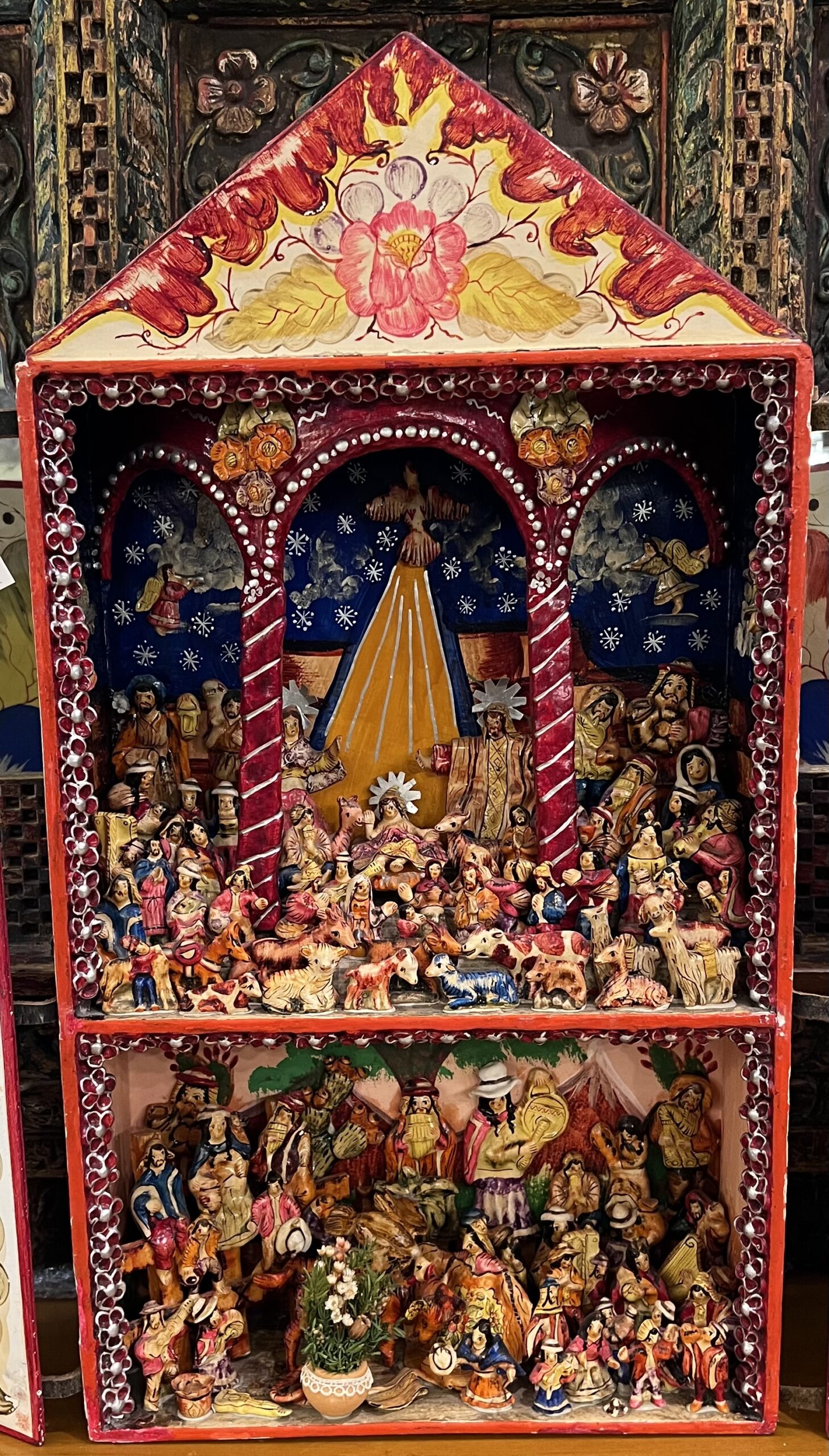 Joyfully crafted vintage Peruvian Nativity Large Retablo, 16″w x 6″d x 29 1/2″h closed, 32″ wide with doors open . Two full scenes with dozens of hand-crafted and painted figures.