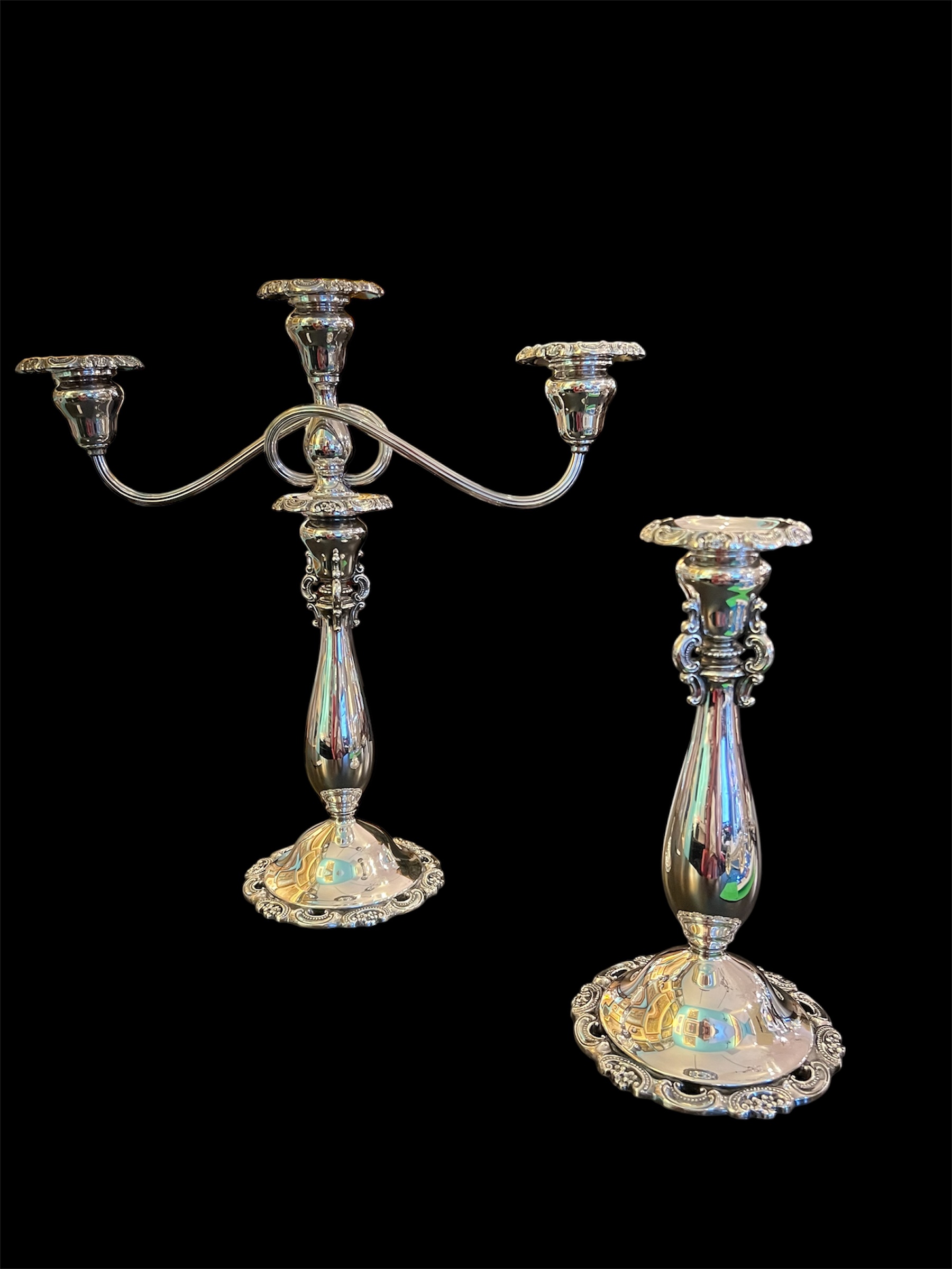 Two-way Pair Wallace Convertible Silverplate Candelabra in Baroque pattern. Total dimensions, with three arm candelabra, 14″w x 14″d, single candlestick is 9 1/2″ h.