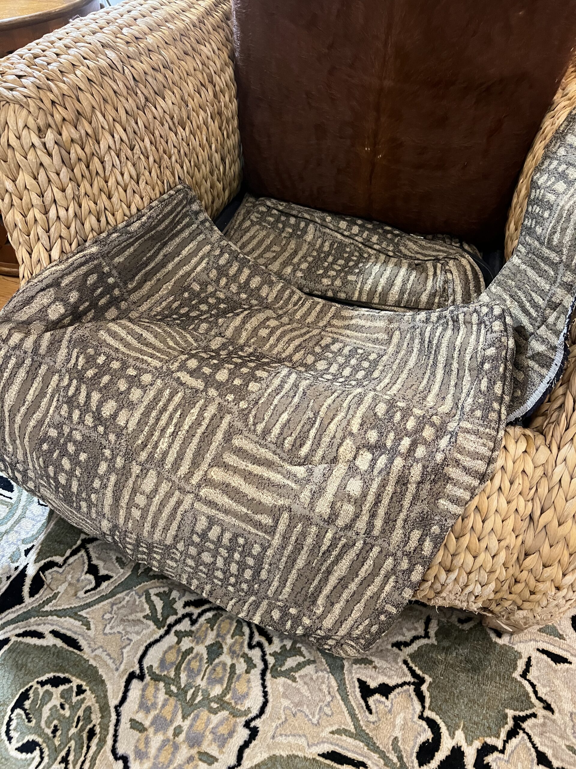 Vintage 1990’s oversized Ralph Lauren Woven Seagrass Club Chair, covered in brown and white cowhair hide. Extra cushion covers included (see photo). This lounge stuyle chair measures 35″w x 45″d x 35″h, with a seat height of 16″.