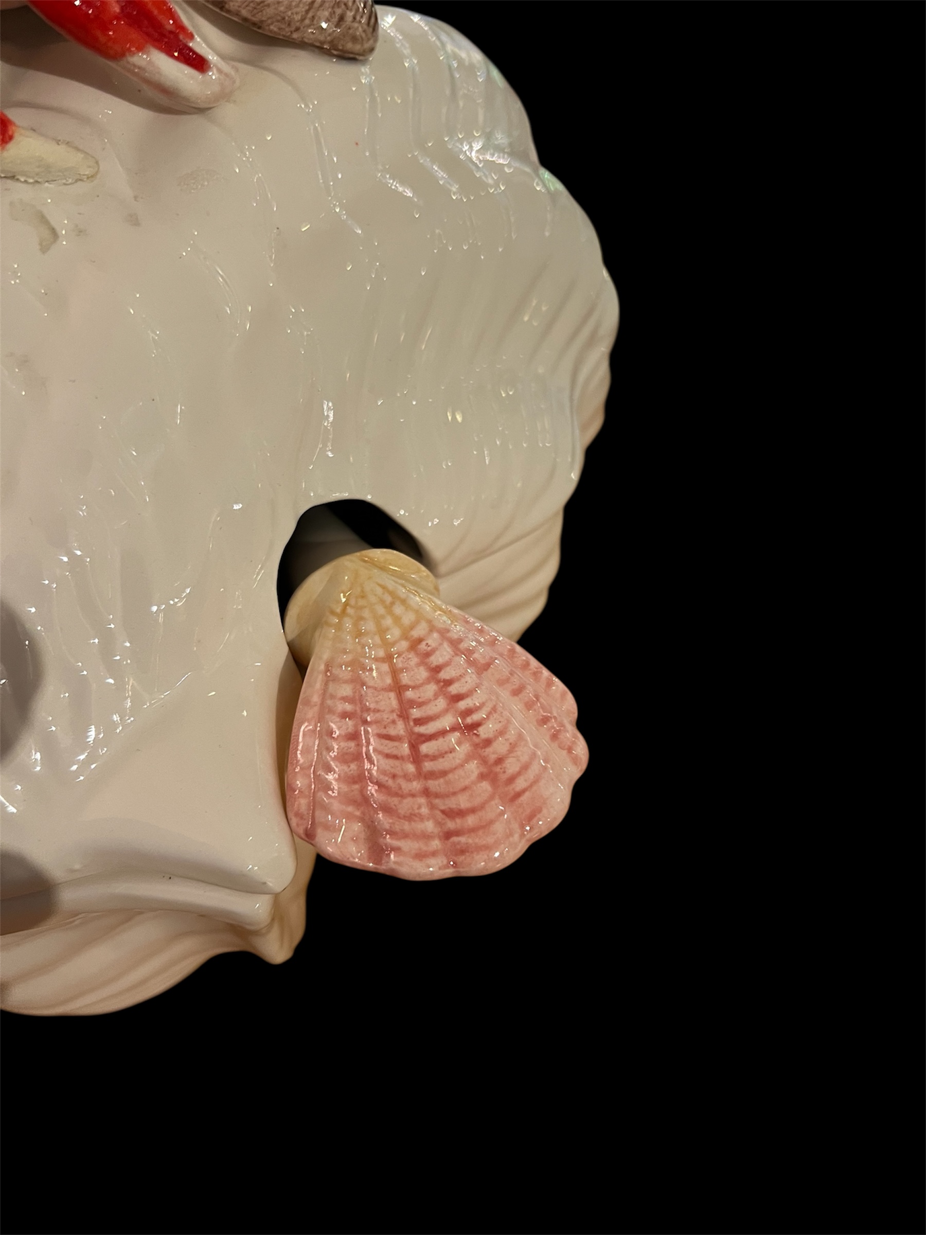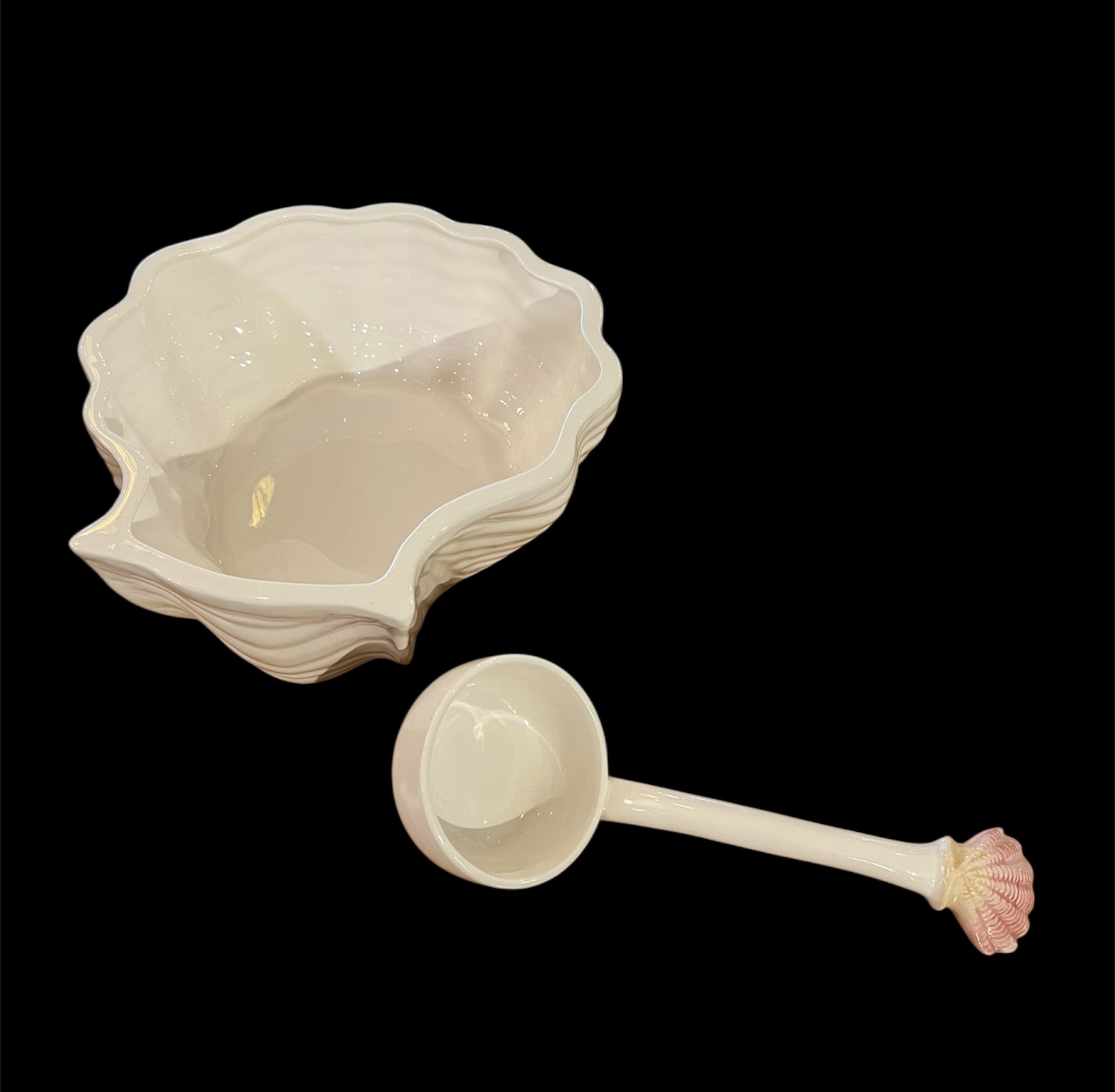 Vintage Italian Crab Tureen in white majolica ceramic, featuring a crab finial an scallop shell topped ladle. Seashell-shaped tureen measures 9″ diameter x 8″h, with a generous 9″ l ladle.
