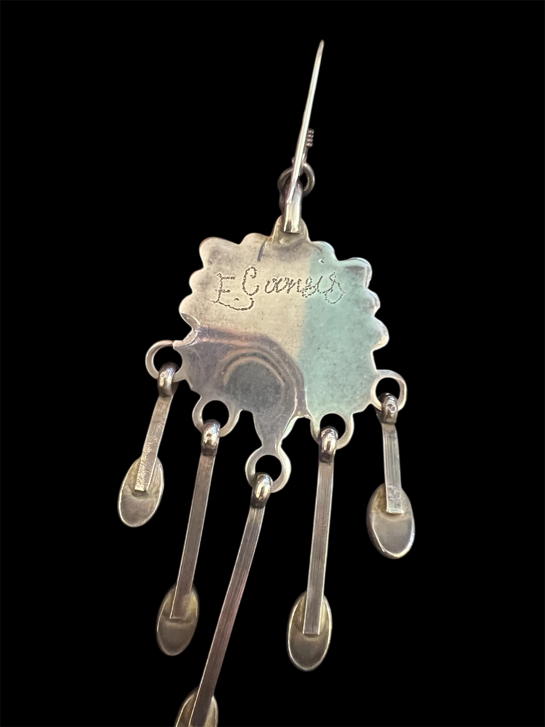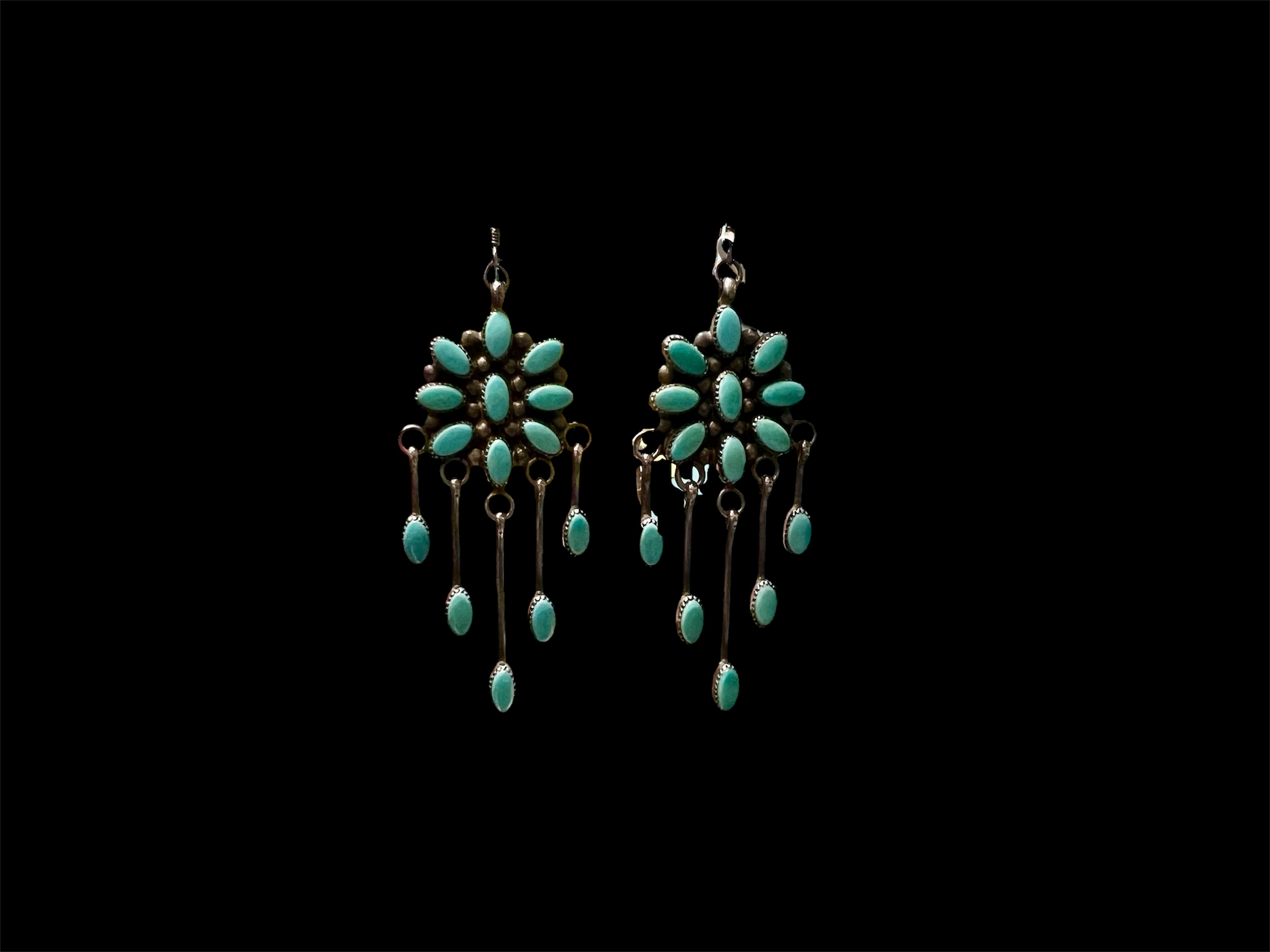 3″ drop vintage Turquoise Concho Dangle Earrings, featuring stones from the Sleeping Beauty Mine set in sterling silver, and signed.